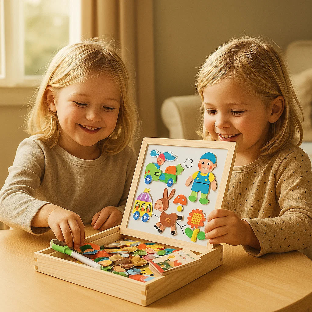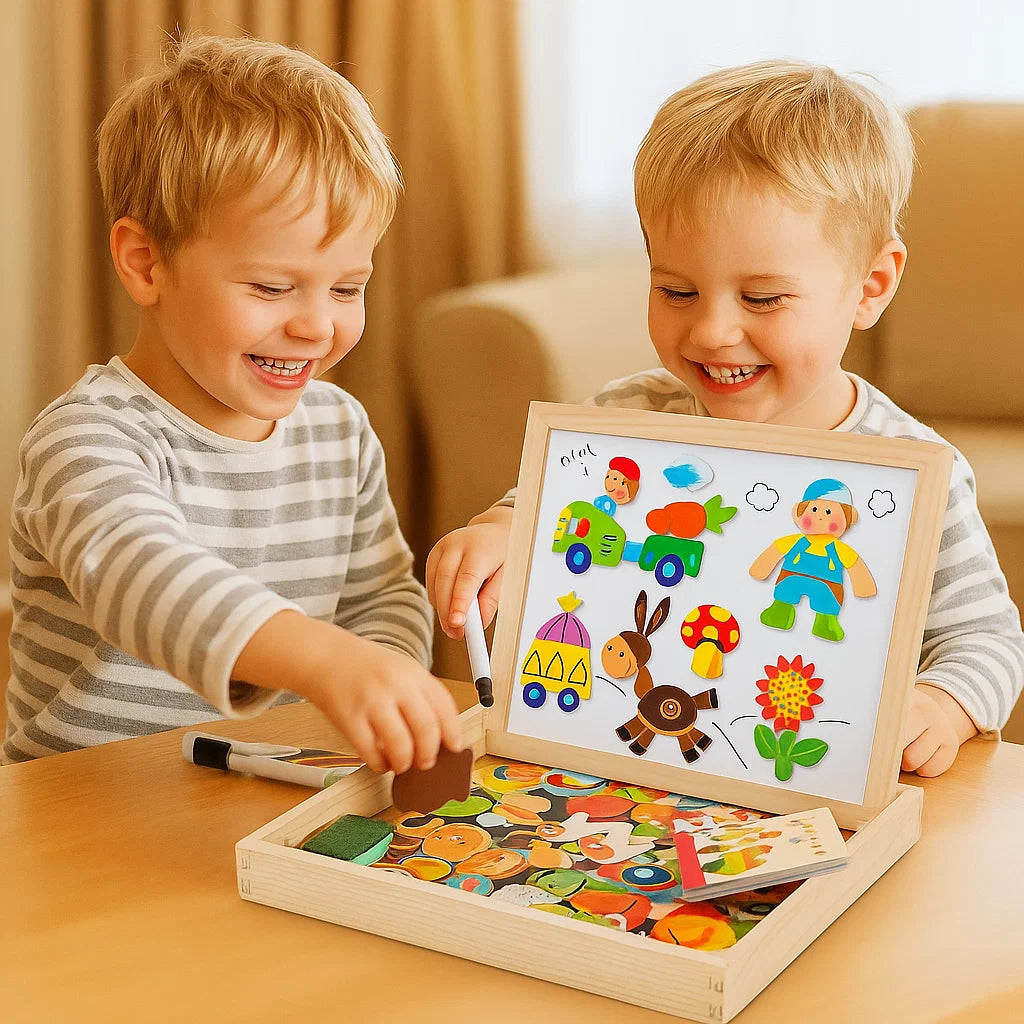 Hyvästi aivottomalle ruutuajalle ja tervehdys käytännön löytöretkelle. Tämä magneettinen palapelitaulu antaa lapsille mahdollisuuden oppia muotoja, parantaa koordinaatiota ja ilmaista mielikuvitustaan ilman puhelinta tai tablettia. He keskittyvät ja viihdyttävät itseään ja kehittävät samalla kriittistä ajattelua ja ongelmanratkaisutaitoja - kaikki tämä leikin avulla, joka tuntuu hauskalta, ei kotitehtävältä.
